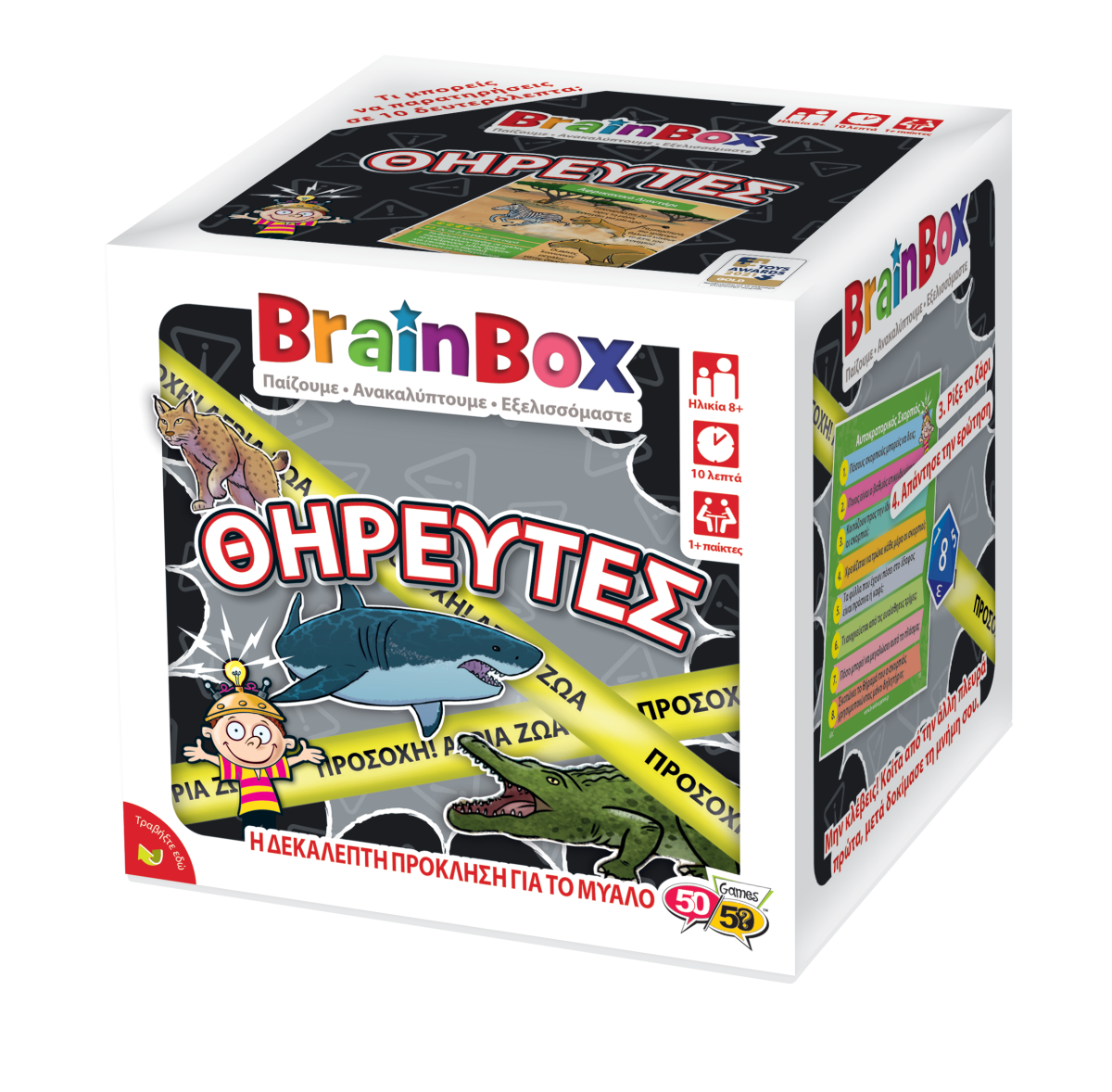 Πρόσεχε! Μερικά από τα πιο επικίνδυνα πλάσματα στον πλανήτη βρίσκονται μέσα σε αυτό το BrainBox, περιμένοντας να δουν αν οι παρατηρητικές και μνημονικές σου ικανότητες είναι αρκετά καλές για να σε κρατήσουν ασφαλή! Από τον γκρίζο λύκο ως τον μεγάλο λευκό καρχαρία, από τον χρυσό δηλητηριώδη βάτραχο ως την πολική αρκούδα, από τη βασιλική κόμπρα ως την όρκα, αυτό το φανταστικό BrainBox περιέχει τα πιο άγρια και τα πιο τρομακτικά ζώα του ζωικού βασιλείου. Τολμάς να ανοίξεις το κουτί;