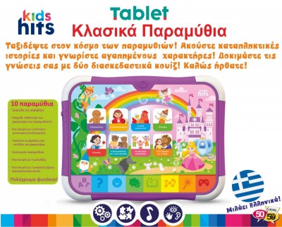 Ανακαλύψτε τις μοναδικές αφηγήσεις του Tablet Κλασικά Παραμύθια! Με αυτό το διαδραστικό παιχνιίδι το παιδί γνωρίζει τους χαρακτήρες κλασικών και αγαπημένων παραμυθιών και διασκεδάζει δοκιμάζοντας τις γνώσεις του μέσα από 2 έξυπνα κουίζ. Οι αφηγήσεις των παραμυθιών, τα λαμπερά φωτάκια και τα χαρούμενα τραγούδια στα Ελληνικά συνθέτουν ένα εκπαιδευτικό περιβάλλον που διατηρεί αμείωτο το ενδιαφέρον του παιδιού.