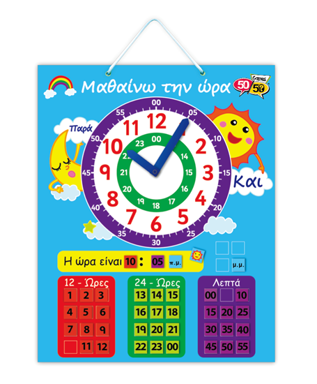 Με αυτόν τον διαδραστικό μαγνητικό εκπαιδευτικό πίνακα, τα παιδιά προσχολικής ηλικίας μπορούν να μάθουν την ώρα παίζοντας. Χρησιμοποιώντας τα μαγνητικά εξαρτήματα και κουνώντας τους δείκτες του ρολογιού μαθαίνουν για την ώρα, τα λεπτά, την έννοια του "και μισή" και το "παρά πέντε"! Ένα πρωτότυπο παιχνίδι για παιδιά νηπιαγωγείου και δημοτικού. Περιέχονται 40 μαγνήτες.